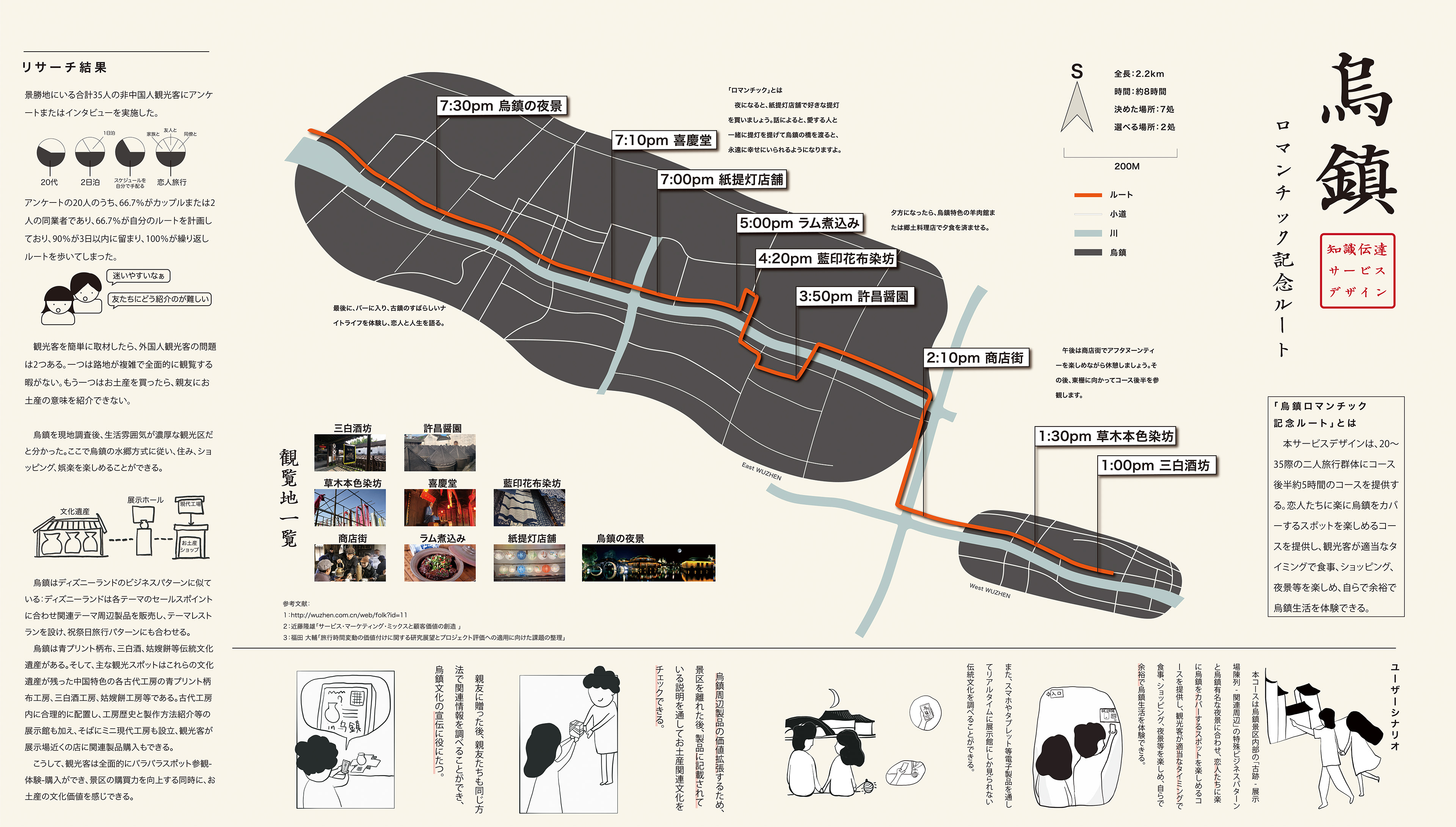 本インフォメーションデザインは、20~35際の二人旅行群体にコース後半約5時間のコースを提供する。恋人たちに楽に烏鎮をカバーするスポットを楽しめるコースを提供し、観光客が適当なタイミングで食事、ショッピング、夜景等を楽しめ、自らで余裕で烏鎮生活を体験できる。